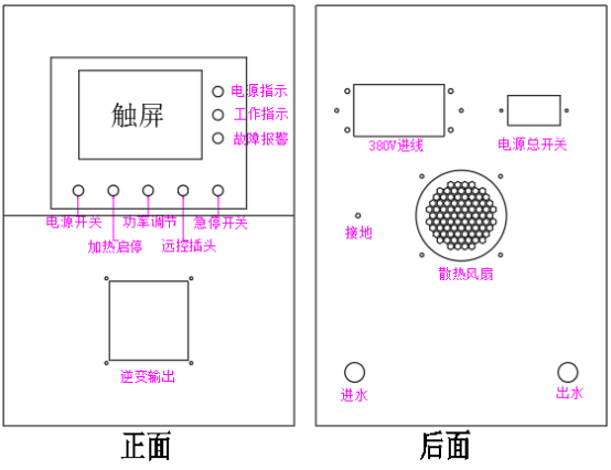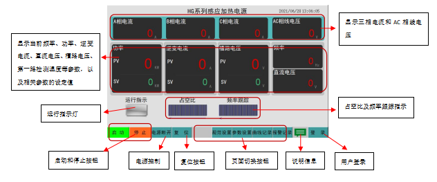 “启动”和“停止”:长按“启动”按钮2秒左右感应加热电源开始输出,点击“停止”按钮感应加热电源立刻停止运行;